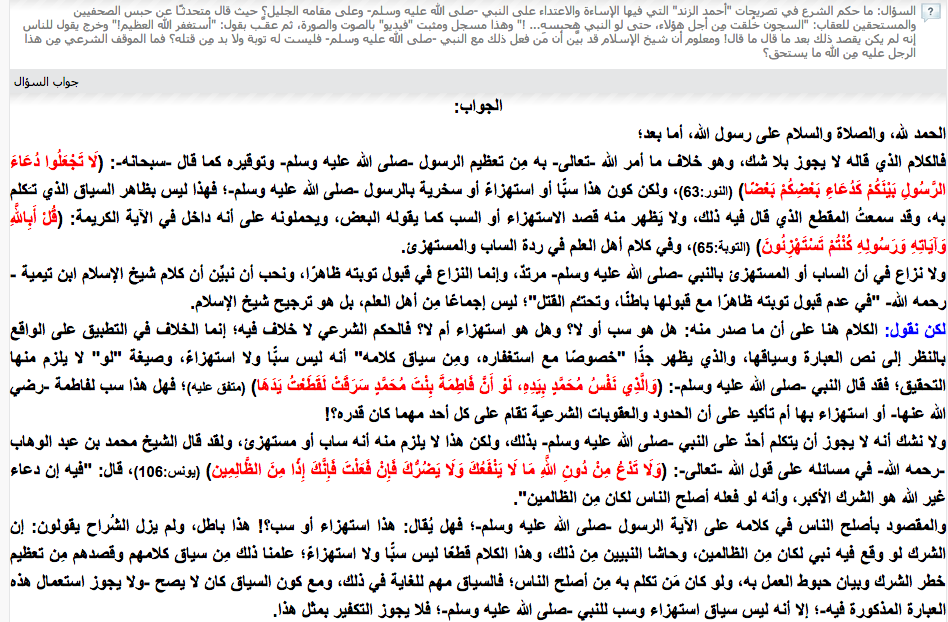 وأضاف "برهامي"، "لا نزاع في أن الساب أو المستهزئ بالنبي صلى الله عليه وسلم مرتدٌ، وإنما النزاع في قبول توبته ظاهرًا، ونحب أن نبيِّن أن كلام شيخ الإسلام ابن تيمية في عدم قبول توبته ظاهرًا مع قبولها باطنًا، وتحتـُّم القتل؛ ليس إجماعًا مِن أهل العلم، بل هو ترجيح شيخ الإسلام.. لا نشك أنه لا يجوز أن يتكلم أحدٌ على النبي صلى الله عليه وسلم بذلك، ولكن هذا لا يلزم منه أنه ساب أو مستهزئ".