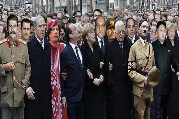 بعد تقدم رئيس وزراء الكيان الصهيوني بنيامين نتنياهو مظاهرة مكافحة الإرهاب التي قادها زعماء العالم في العاصمة الفرنسية باريس، تداولت مواقع التواصل الاجتماعي صور للزعماء الذين كان من المفترض حضورهم للمظاهرة مع نتنياهو وزعماء العالم المتهمين بجرائم حرب.
