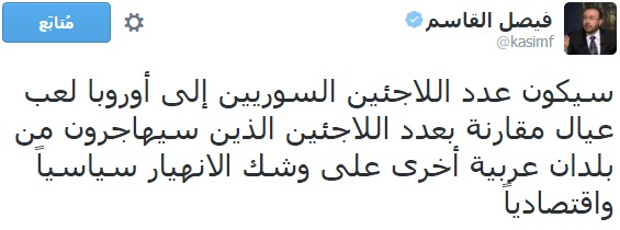 وقال القاسم في تغريدة له عبر حسابه الشخصي على موقع التواصل الاجتماعي "تويتر": "سيكون عدد اللاجئين السوريين إلى أوروبا لعب عيال مقارنة بعدد اللاجئين الذين سيهاجرون من بلدان عربية أخرى على وشك الانهيار سياسيًا واقتصاديًا".