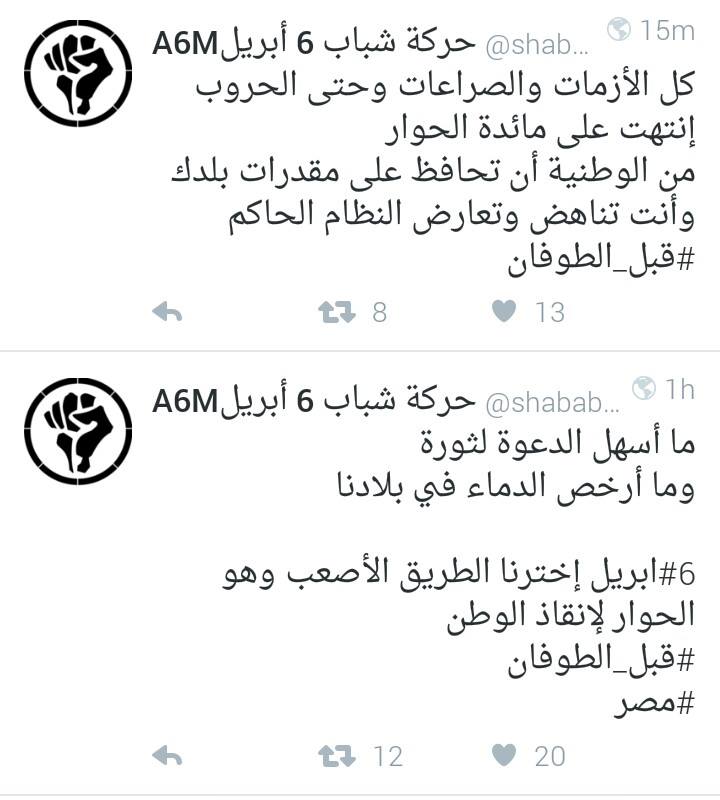 أعلنت حركة شباب 6 أبريل، الجمعة، عبر حسابها الرسمي على موقع التغريدات الاجتماعية "تويتر" عدم تأييدها لأي دعوات من أجل التظاهر، داعية للحوار من أجل حل الأزمة ونبذ العنف وعدم الاحتقان.