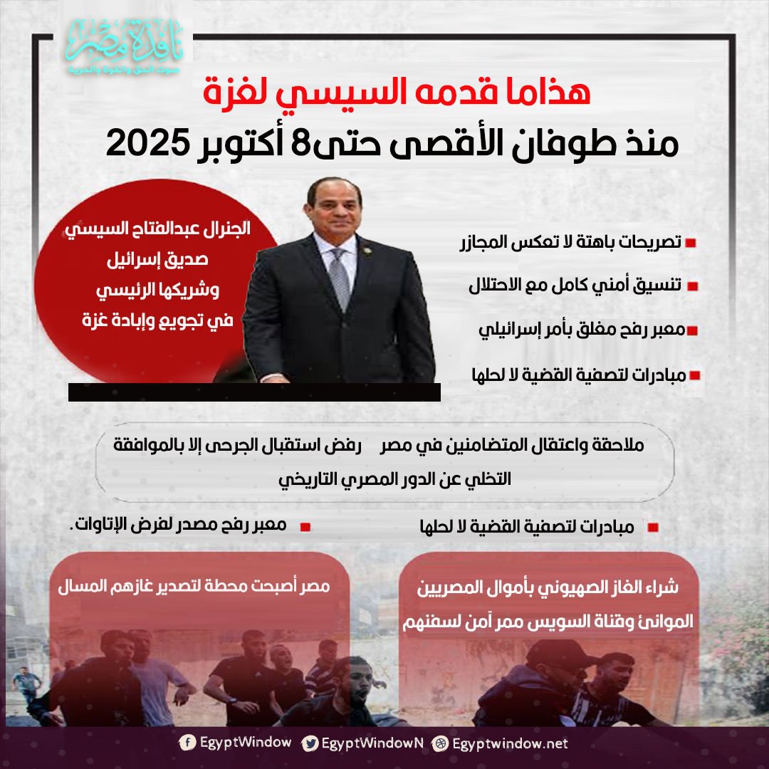 تبلورت مواقف قائد الانقلاب العسكري عبد الفتاح السيسي تجاه القضية الفلسطينية بين الخذلان والعجز والخيانة إزاء مأساة أهالي غزة، بعدما أطلقت المقاومة الفلسطينية طوفان الأقصى في 7 اكتوبر 2023، فيما يسعى إعلام النظام للركوب على موجة انتصار المقاومة، بعدما أعلن الرئيس الامريكي ترامب عن خطته لوقف النار في غزة...