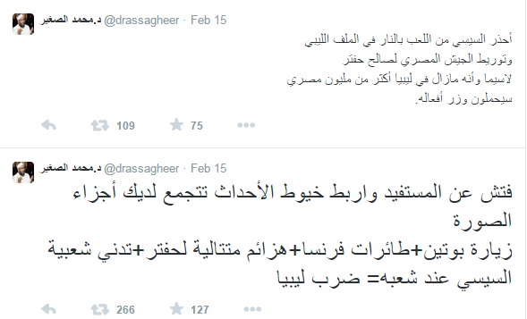 من جانبه، علق علق د.محمد الصغير، عضو مجلس الشورى المصري السابق، فى تغريدة له على حسابه على موقع التواصل الاجتماعى "تويتر" على توجية الجيش المصرى ضربة جوية على أهداف داعش فى ليبيا قائلا:"فتش عن المستفيد واربط خيوط اﻷحداث تتجمع لديك أجزاء الصورة زيارة بوتين+طائرات فرنسا+هزائم متتالية لحفتر+تدني شعبية السيسي عند شعبه= ضرب ليبيا"