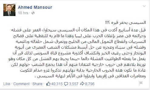 فيما قال الإعلامي أحمد منصور، السيسى يحفر قبره، فقبل عدة أسابيع أكدت فى هذا المكان أن السيسى سيحاول القفز على فشله وجرائمه فى مصر بإعلان الحرب على ليبيا.