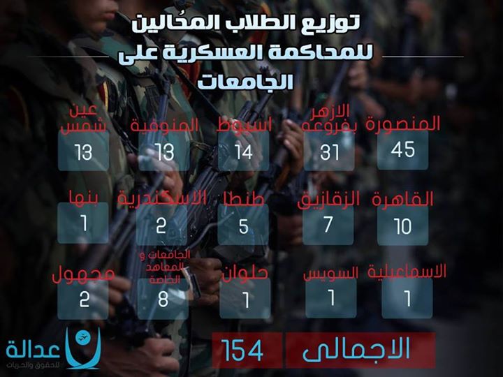 نشر مركز "عدالة" للحقوق والحريات، إحصائية عن عدد الطلاب المحالين للمحاكمة العسكرية منذ انقلاب 3 يوليو 2013، وأن عددهم يساوي 154 ، موزعين على الجامعات المصرية بالمحافظات.
