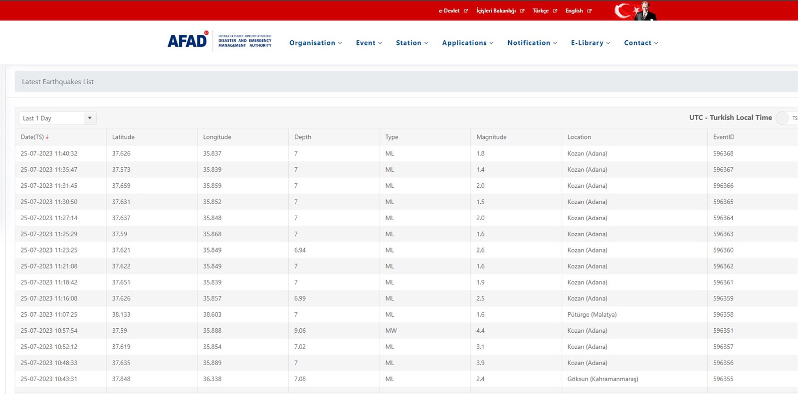 وبدورها، قالت الهيئة العامة لإدارة الكوارث التركية (أفاد) إن الزلزال وقع عند الساعة 08:44 بالتوقيت المحلي (5:44 صباحا بتوقيت غرينتش) بمنطقة كوزان بولاية أضنة، حسبما نقلت وكالة أنباء "الأناضول".