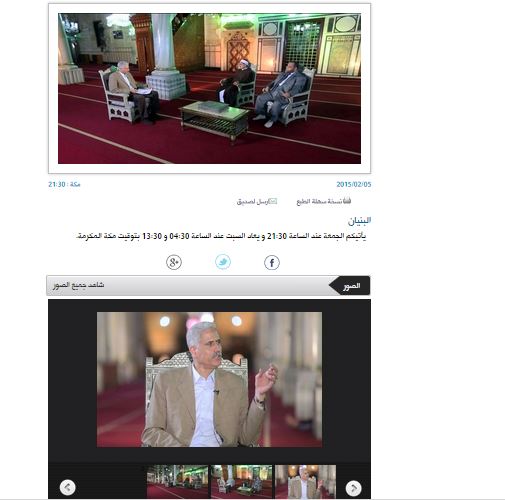 وقالت القناة لأول مرة بالتاريخ أنها ستصوّر برنامجا حواريا دينيا باسم "البنيان" داخل مسجد الإمام الحسين في وسط القاهرة، ويُذاع على القناة كل جمعة، ويقدمه الدكتور عبد الحليم العزمي، مدير تحرير مجلة الإسلام وطن، لسان الطريقة العزمية الصوفية، رغم أن وزارة الأوقاف تحظر تصوير أي برامج دينية في مساجد الأوقاف إلا بموافقة كتابية منها وأخذ تصاريح أمنية.