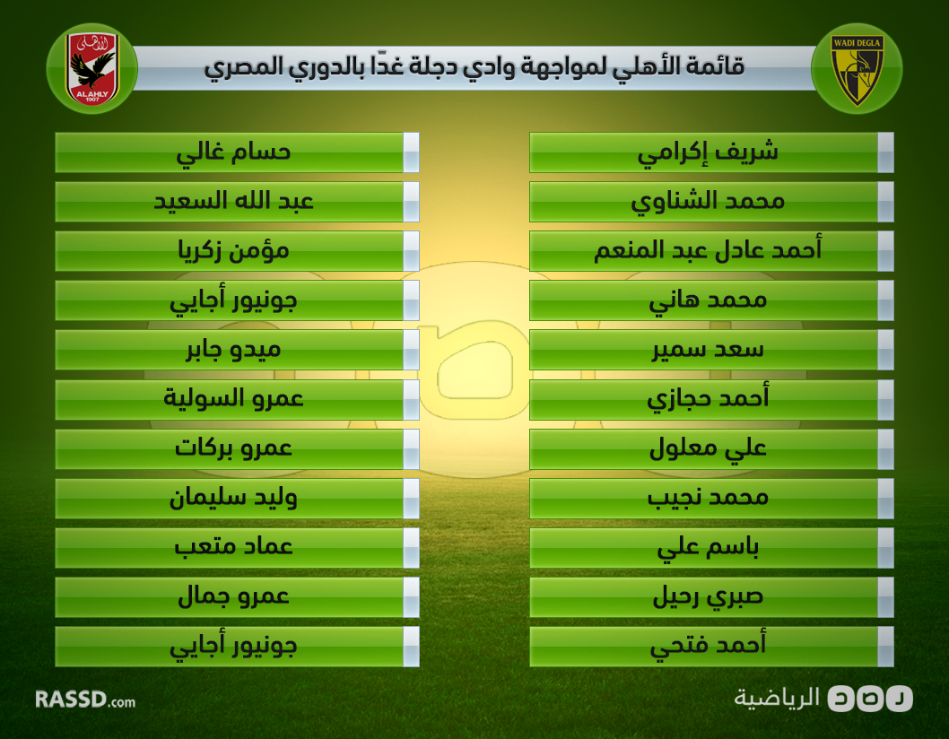 أعلن الجهاز الفني لفريق الكرة بالنادي الأهلي قائمة الفريق التي تخوض مواجهة غدٍ الخميس أمام فريق وادي دجلة.